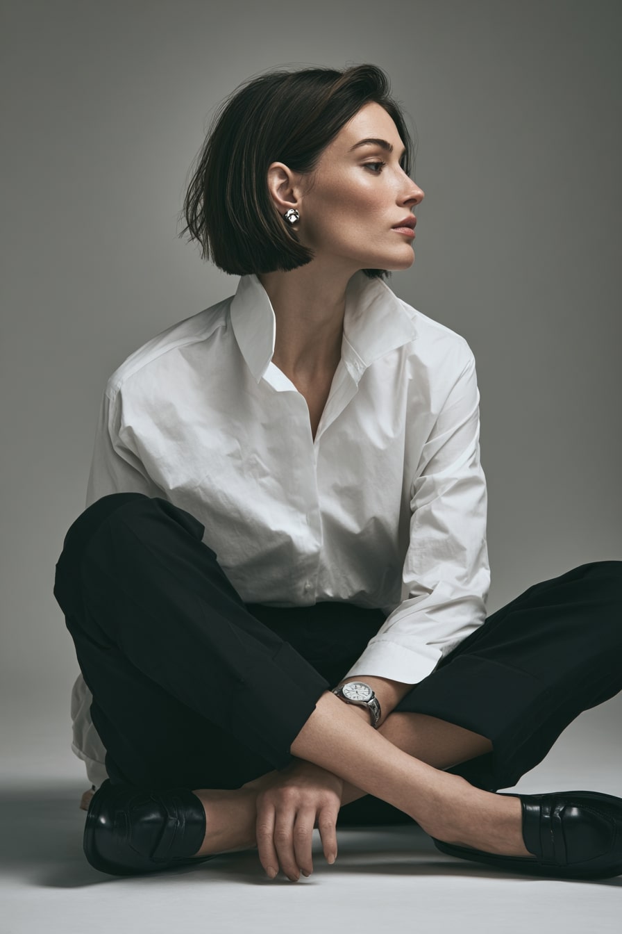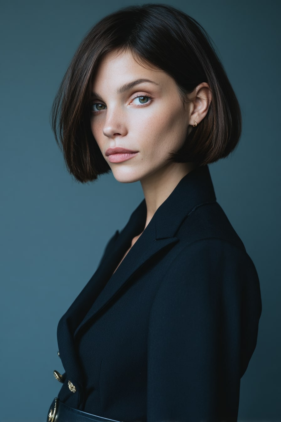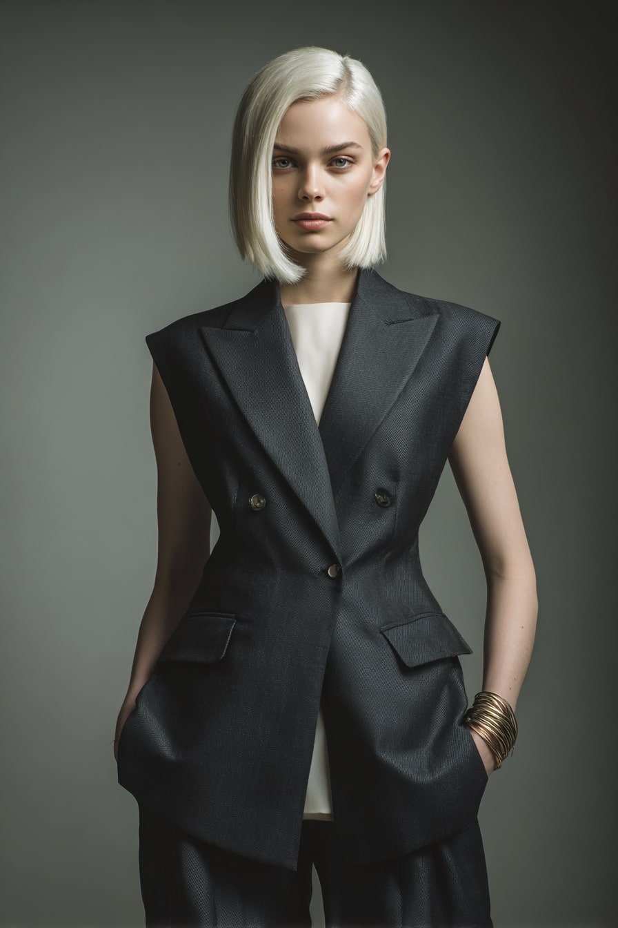1. Sculpted Grace Sleek Bob with Tailored Monochrome Ensemble