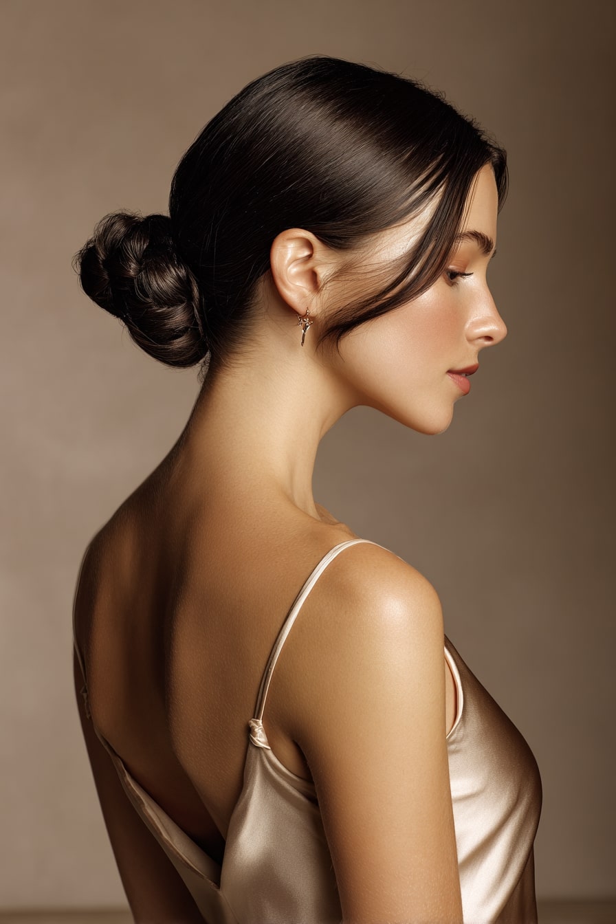 6. Sculpted Minimal Polished Low Bun and Satin Slip