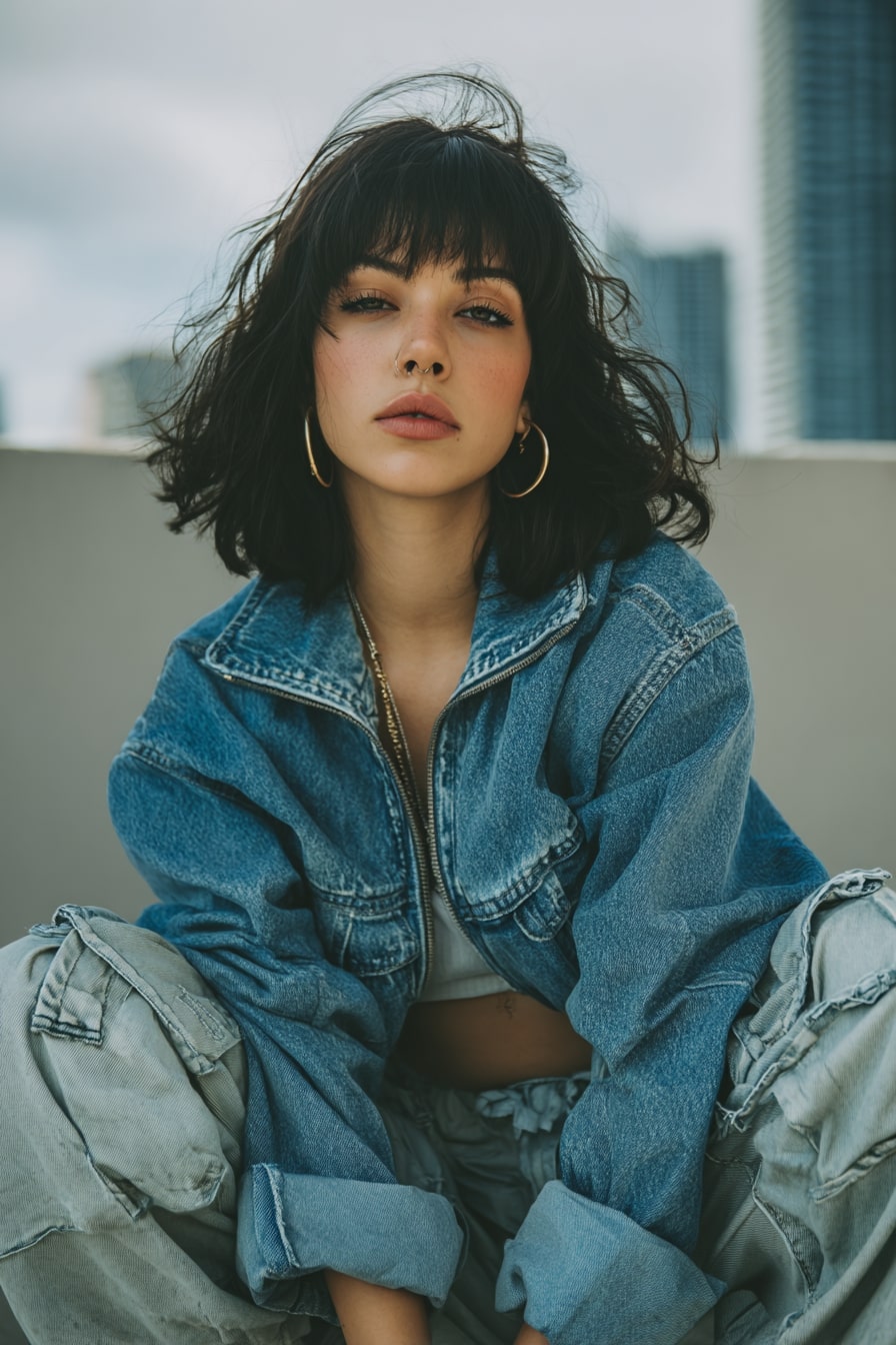 3. Urban Fringe Wispy Bangs and Cropped Denim Jacket