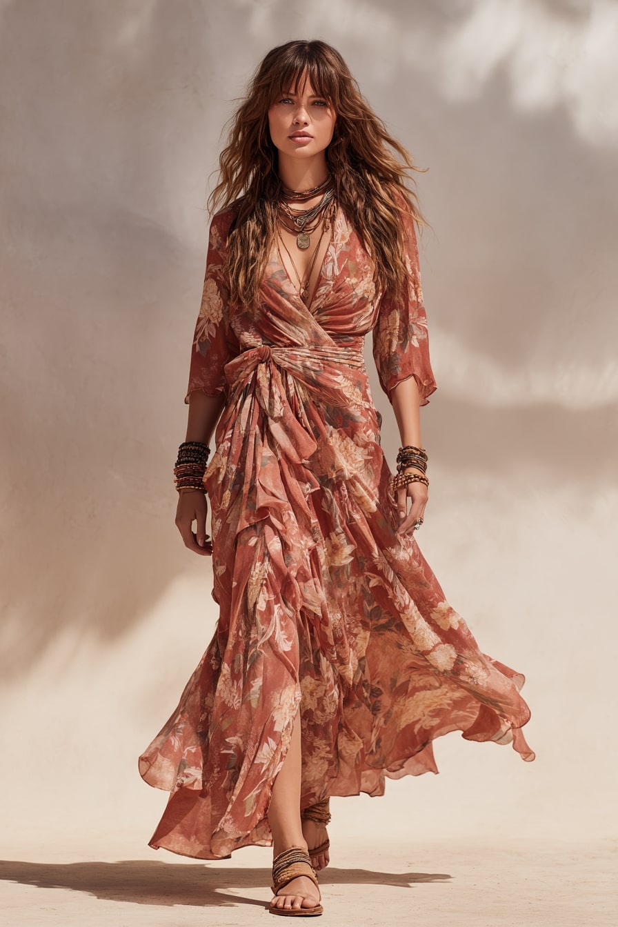 9. Boho Layers Curtain Bangs and Maxi Wrap Dress