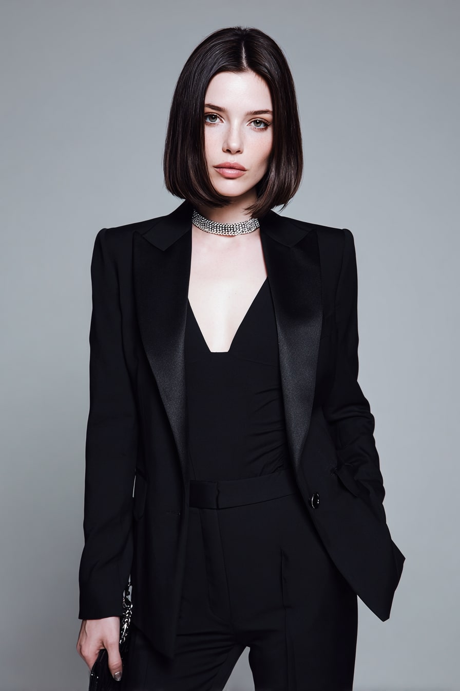 A neck-skimming bob cut with clean symmetry and high shine creates a sculpted outline that flatters oval proportions. Length holds just long enough to curve inward, giving the silhouette a polished softness even within its sharp geometry. Texture stays sleek yet cushioned, allowing subtle movement at ends without breaking the controlled finish.