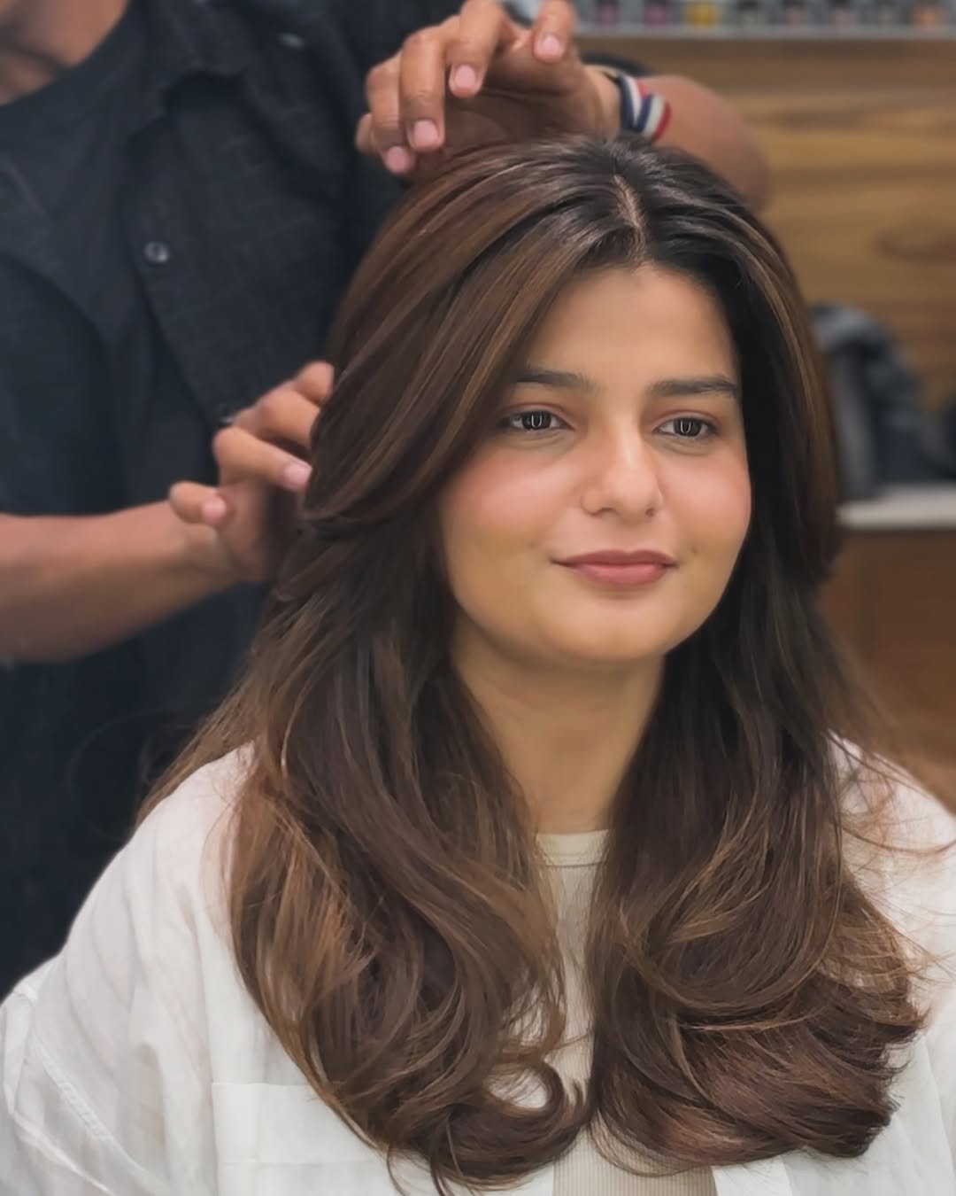- Crown area shaped with gentle volume, achieved through minimal backcombing or root-lift spray, keeping height balanced and airy.