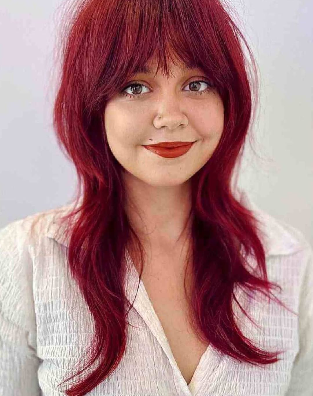 Length drops past shoulders and moves with loose, natural sway, while a full curtain fringe softens upper features and draws attention inward. Texture expands slightly through mid-lengths, giving oval proportions a gentle lift and subtle horizontal presence. Light bends diffuse any sharpness, creating a romantic ease that feels intentional yet unforced.