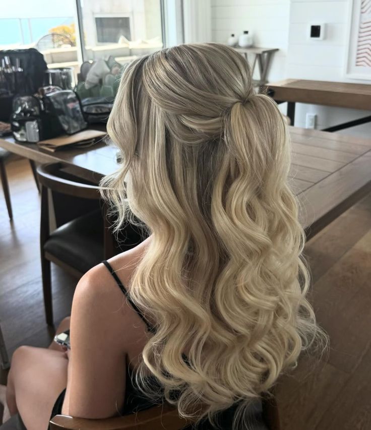 A graceful, lifted half-up style that blends structure and softness beautifully, highlighting an oval face with flowing movement and romantic detail.