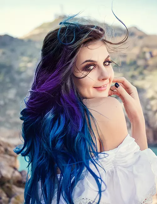 Dark roots melt into flowing curls kissed with cerulean tones. The transition feels smooth, bringing light and vibrance through every strand.