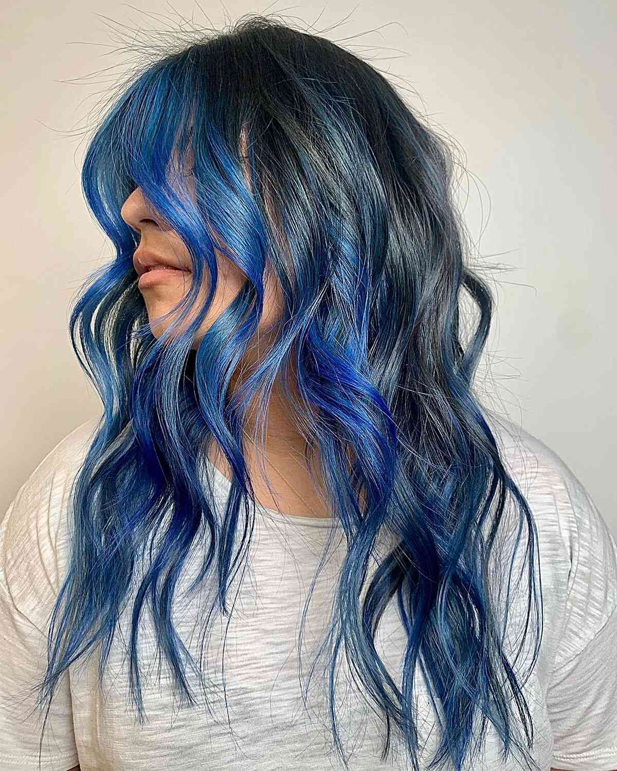 Dark roots create a striking base for waves touched with sapphire blue. The color cascades through each curl, giving movement and dimension.