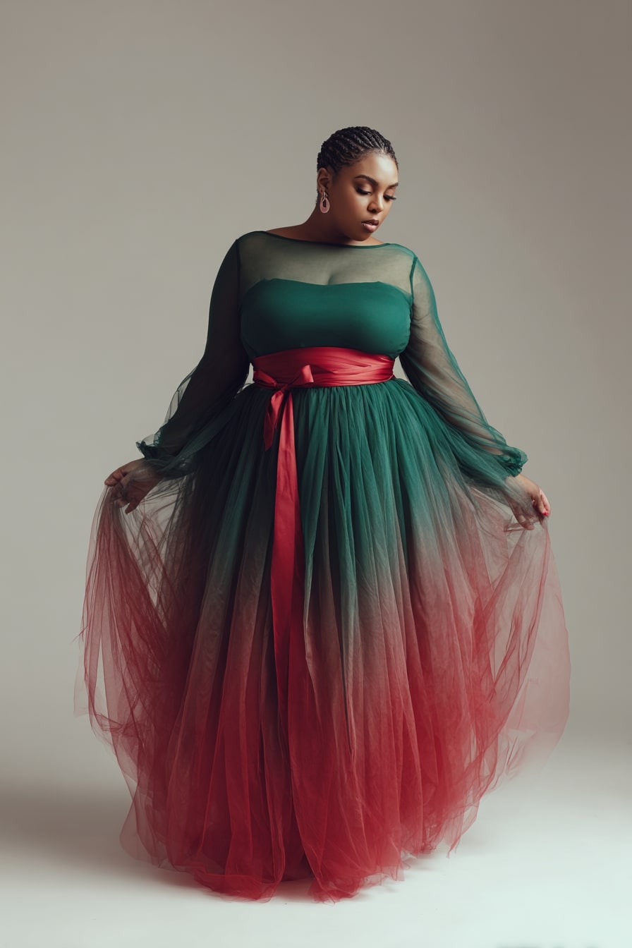 Sheer tulle melts from deep green into warm red, creating a soft ombré effect that feels weightless and ethereal. Gentle layering builds volume without heaviness, and the translucent sleeves add a touch of quiet romance.