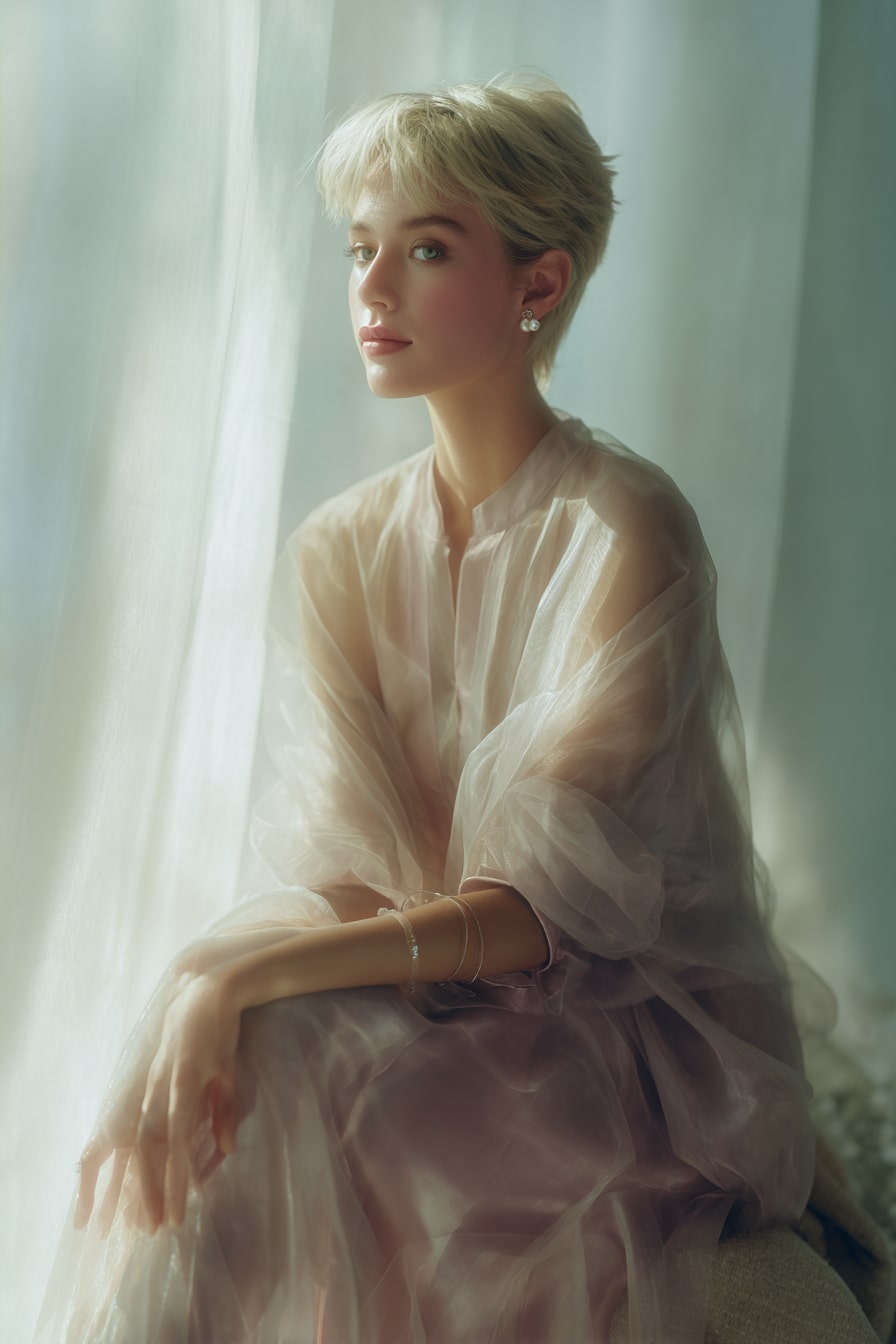 Light plays effortlessly through this cropped feather cut, sculpted to accentuate oval balance with barely-there texture. Layers are diffused from crown to fringe, creating a luminous halo effect that softens every angle of the face. Each section blends seamlessly into the next, offering movement that feels airy, almost weightless. The pale tone amplifies delicacy, catching brightness across each feathered edge for an ethereal, float-like finish.